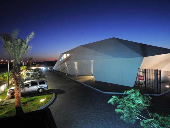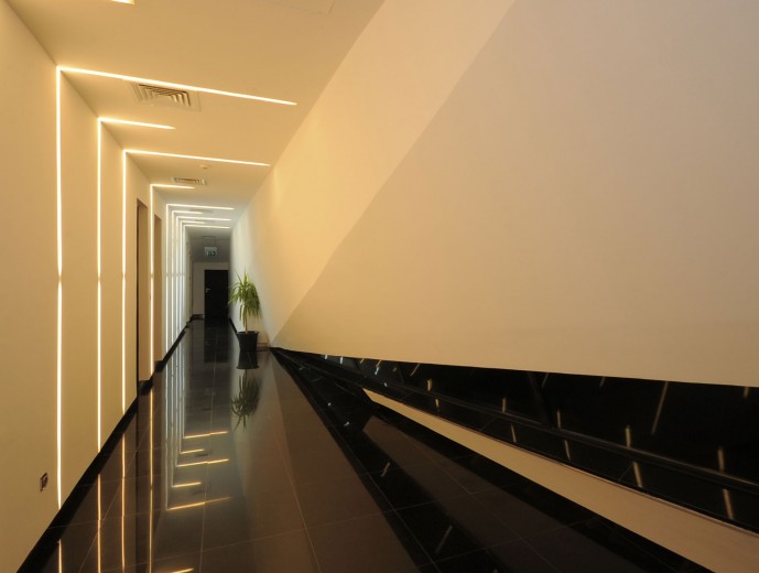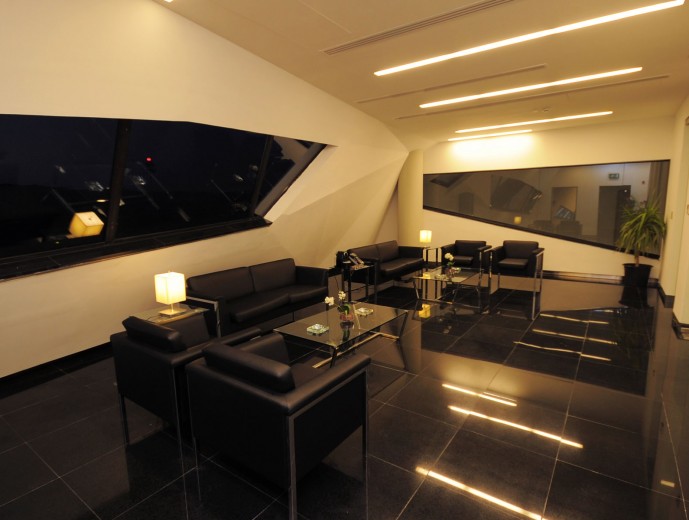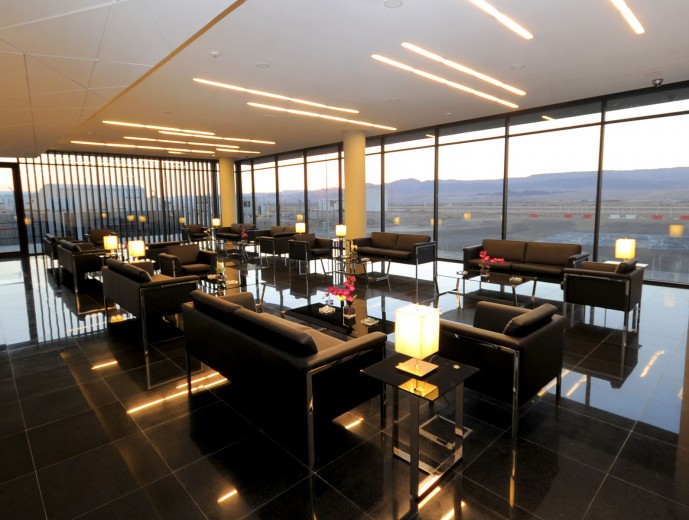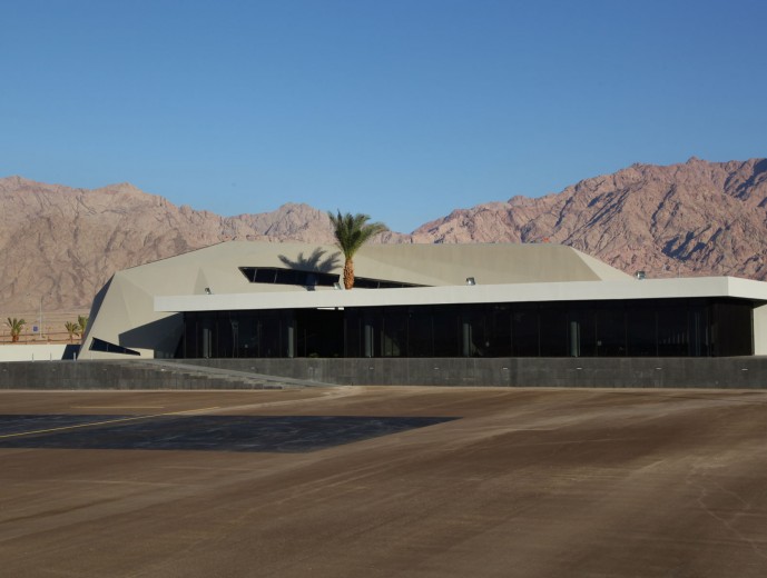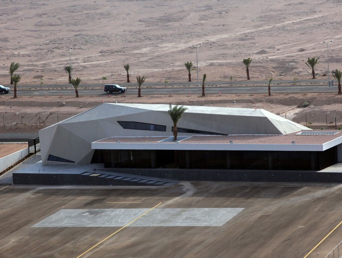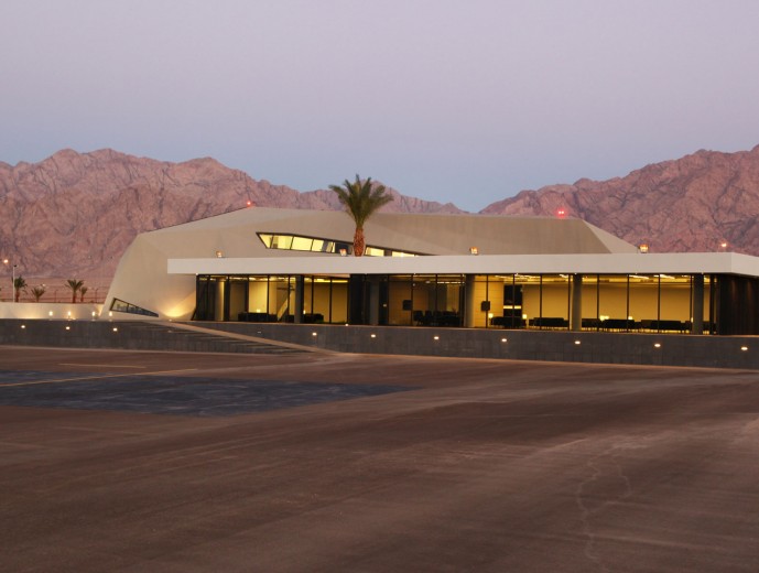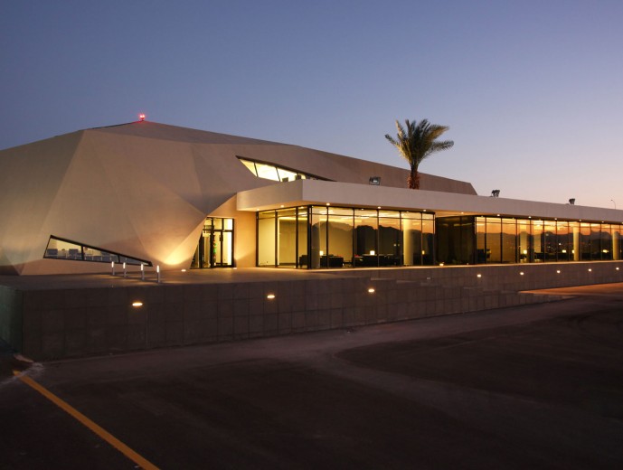 The dynamic form responds to the uniqueness of its location in the relatively rural area of northern suburb of Aqaba in Jordan, through its extensive glazed sections, the reception and lounge area opens out on to the vast mountainous landscape that the city of Aqaba offers. While the concrete skin is molded around functional elements of the building creating a balanced natural light flow, the JP-Jets terminal concrete mass is molded into sharp edged surfaces that represent the rough lines from the surrounding mountains, while the straight lines in the rectangular mass present the human intervention to the desert area. The terminal is perceived as a sculptural landmark in the relatively rural landscape.