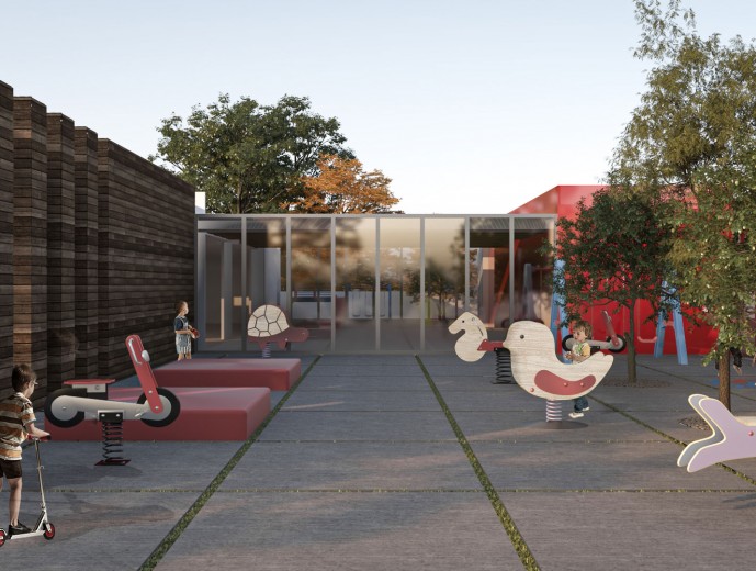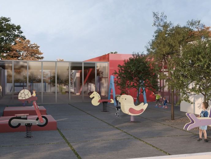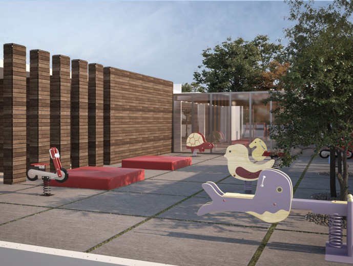 This colorful project serves the children of Tala Bay residents. Putting their safety as a priority, the building was designed around a closed court that forms the main outdoor play area. This court is surrounded by several cubic masses connected by transparent glazed connections. Thus the children are always in contact with nature and their play area, putting them at ease during the hours they spent in the kindergarten.